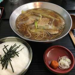 店は大箱の蕎麦屋さん。メニューを眺めて鴨なんばんセット(鴨なんばん+トロロご飯)を注文した。